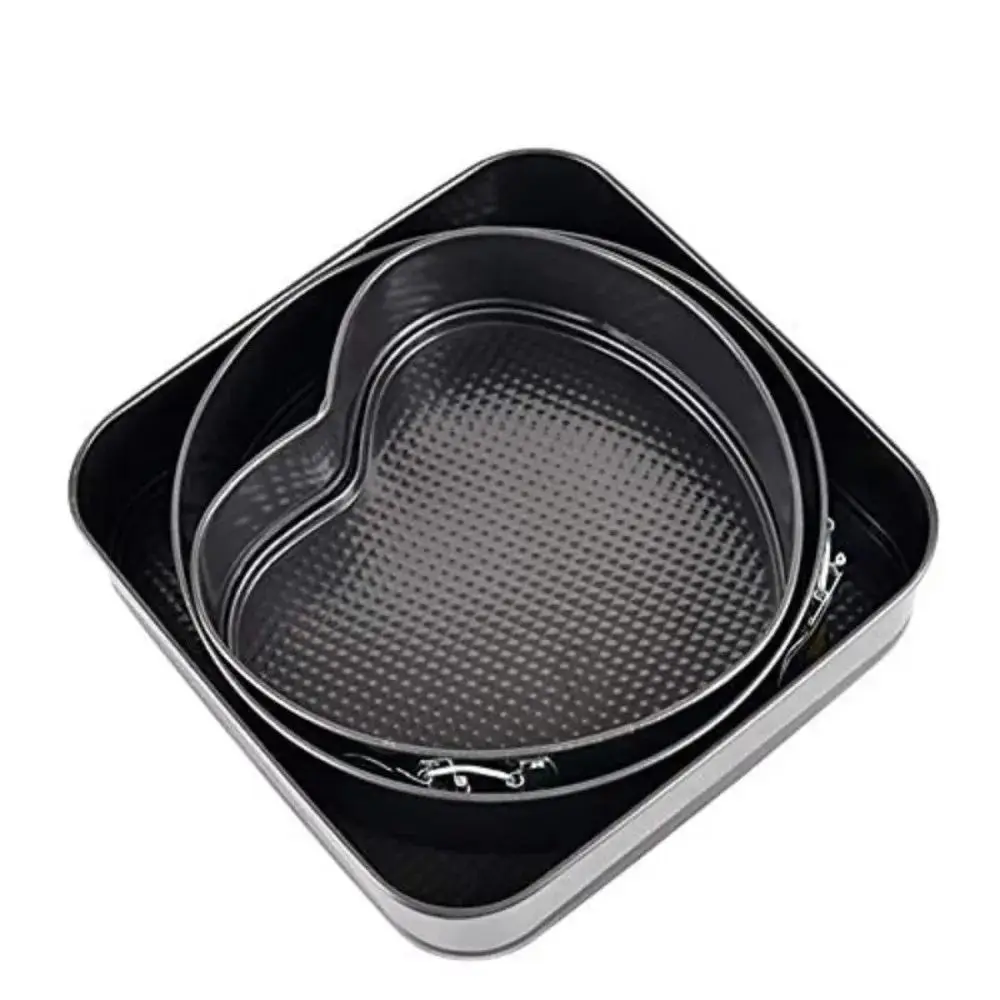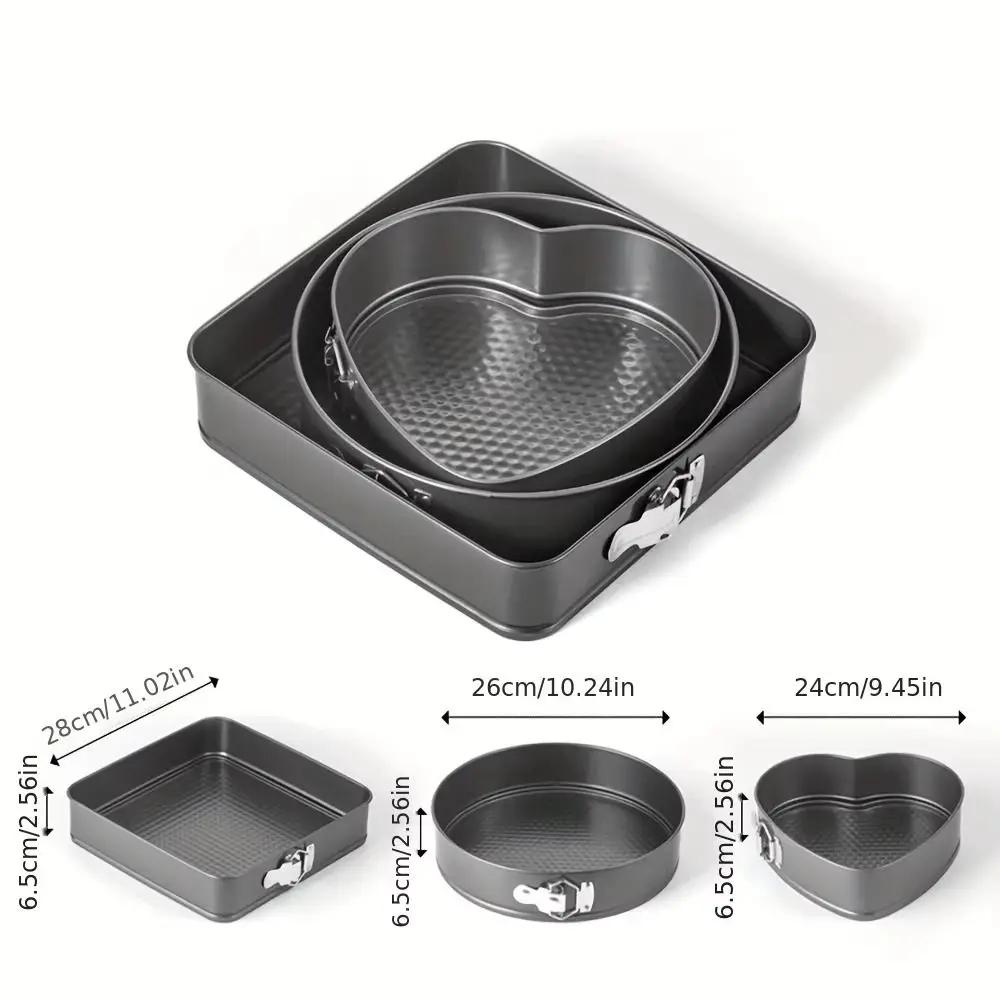 Lot de 3 Moules à Gâteau en Acier Carbone – Formes Cœur, Rond et Carré avec Fond Amovible